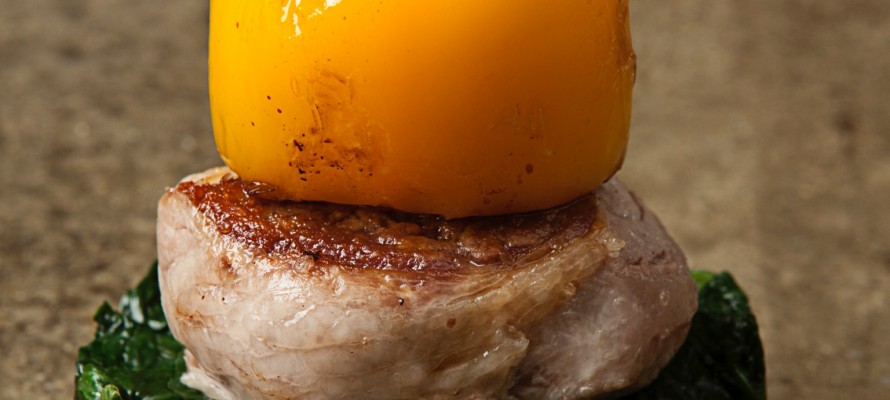 • Con l’aiuto di un coppapasta create una base di spinaci, adagiate il filetto sopra e completate come da immagine con il peperone arrosto.