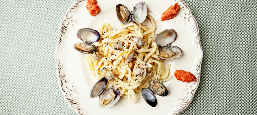 Spaghetti alla chitarra con vongole, pesto di pomodori secchi e pepe nero