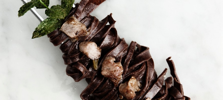 Tagliolini al cacao con bocconcini di maiale al brandy e foglie di menta