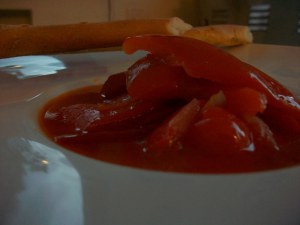 In sudiera ( pentola in coccio) stufare le cipolle in olio aggiungendo poca acqua calda.Unire le falde di peperoni e far cuocere per circa 10 minuti salando le verdure. Aggiungere i pomodori, lasciate andare a fuoco molto lento per 30 minuti coperto e mescolando di tanto in tanto. Bilanciate di gusto.Dopo la cottura lasciate raffreddare a temperatura ambiente.Può essere servita come antipasto estivo o contorno di carni arrosto (sempre in ciotola separata e con pane sciapo fresco).