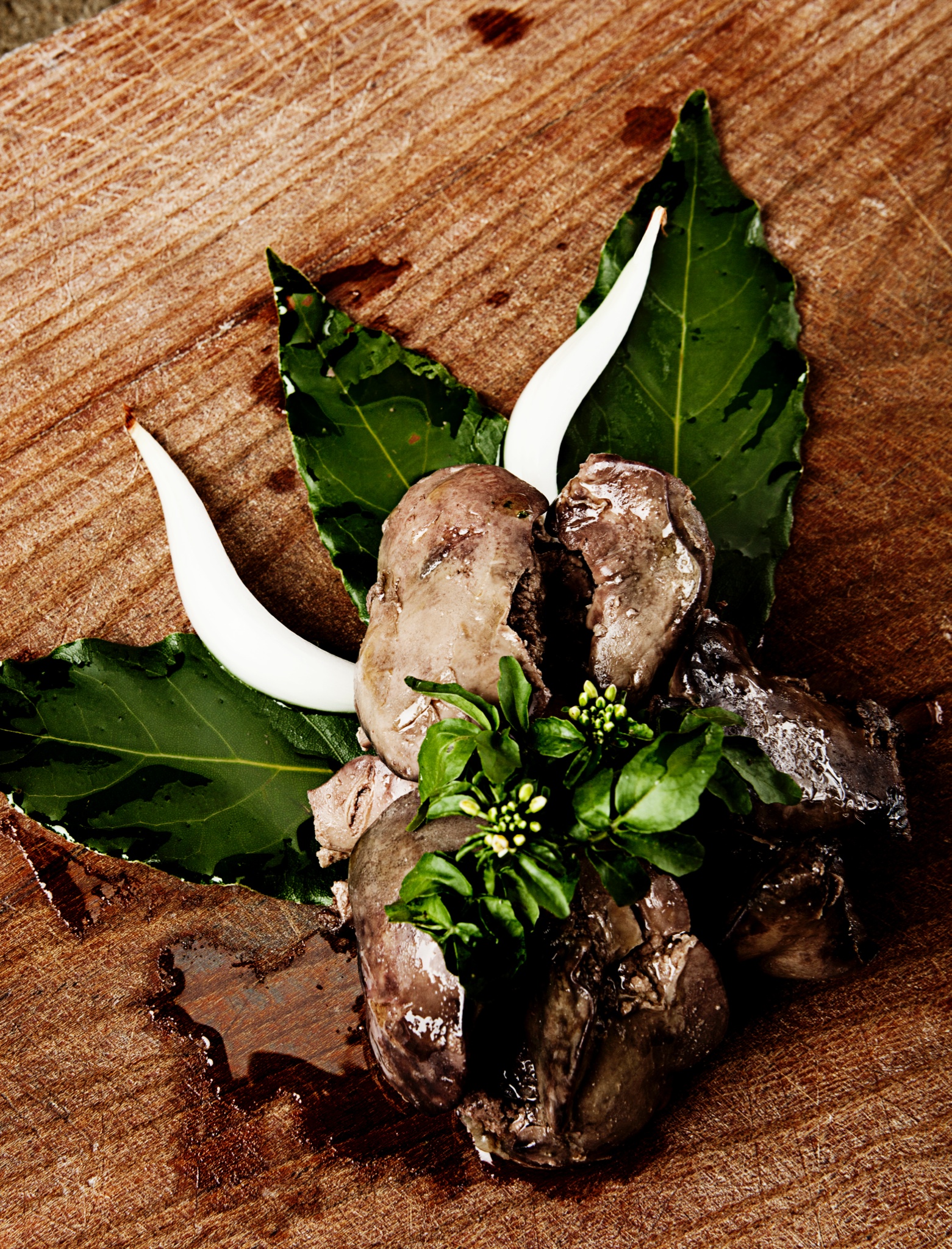 FEGATI DI POLLO ALL'ALLORO CON MARSALA, CIPOLLA CRUDA E CRESCIONE IN INSALATA