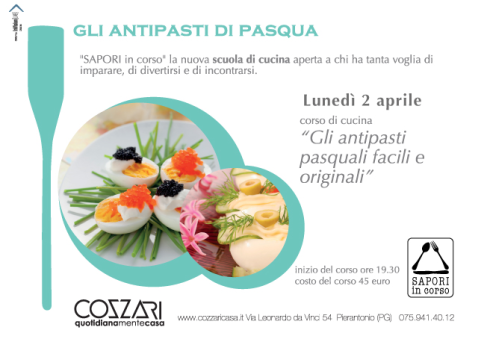 Tutto è pronto per la lezione “Antipasti di Pasqua” …Vi aspetto lunedì 2 Aprile 2012 nella moderna, attrezzatissima aula di Sapori in Corso presso il negozio Cozzari a Pierantonio Perugia (Umbria)