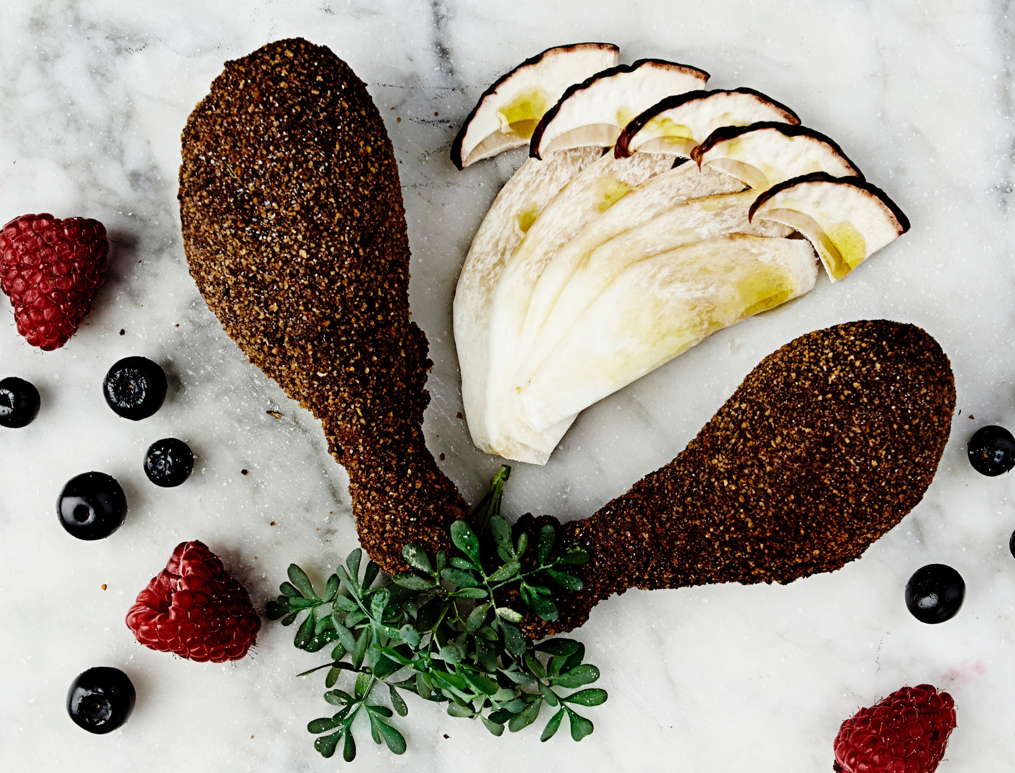 Fusi di pollo fritti panati al cacao con insalata di frutti rossi, porcini e foglioline di ruta