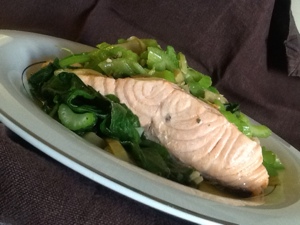 In casseruola di rame alta, scalda olio, aggiungi aglio e carciofo affettato, sfuma con il gin, quindi adagia sopra il salmone con la pelle verso il basso.